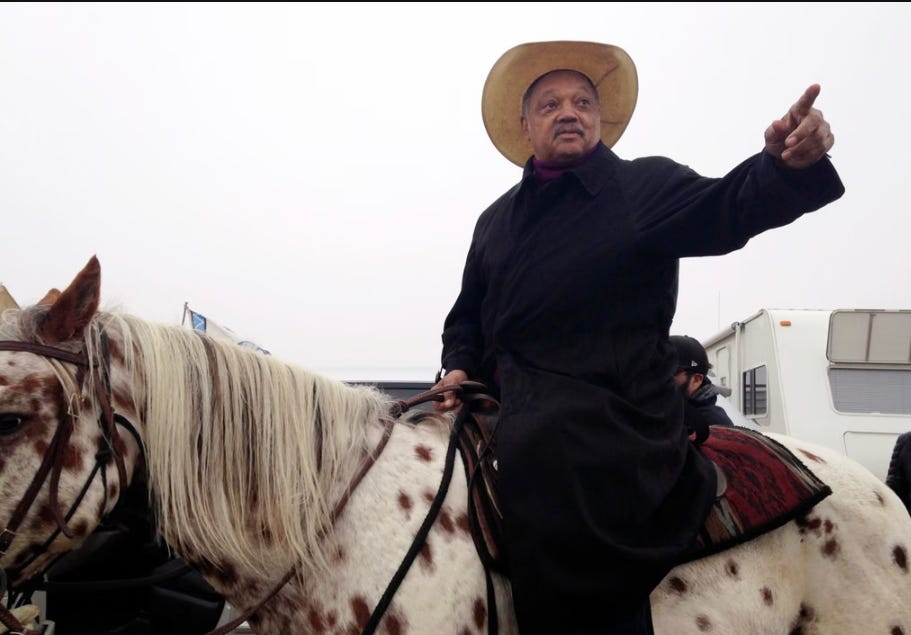 Jackson sits atop a horse while visiting the protest camp against the Dakota Access oil pipeline outside Cannon Ball, North Dakota in October 2016