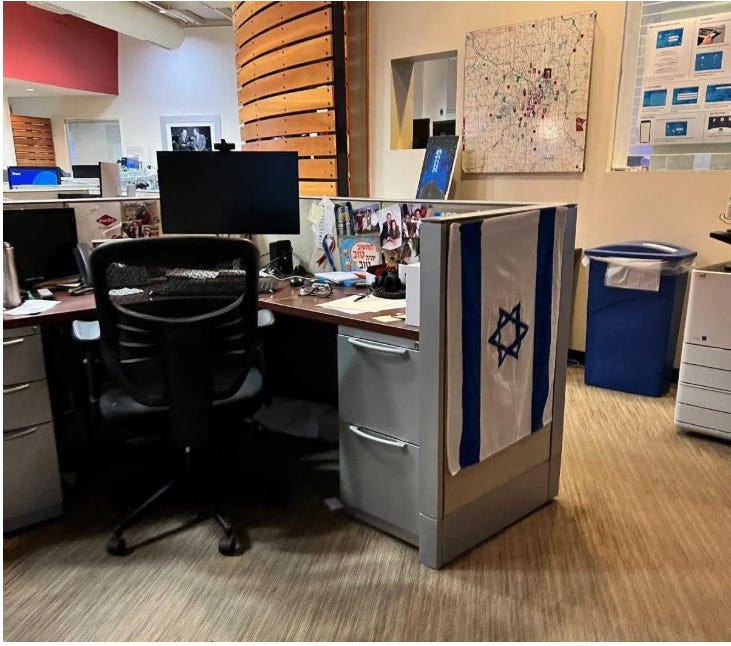 Jonah Kaplan hung a large Israeli flag from his cubicle in the Minnesota CBS office, CHABAD Broadcasting System. Come on, RIchard.