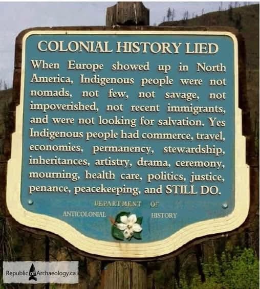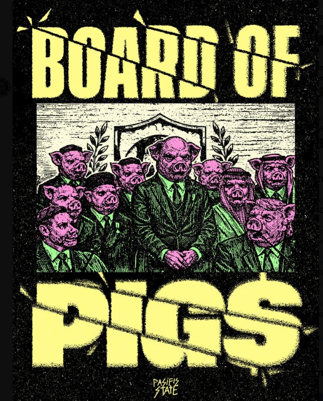 The front of the cart has an official seal, but this one reads “U.S. Department of Stolen Land Security.” Inside the shield on this seal? A masked face.