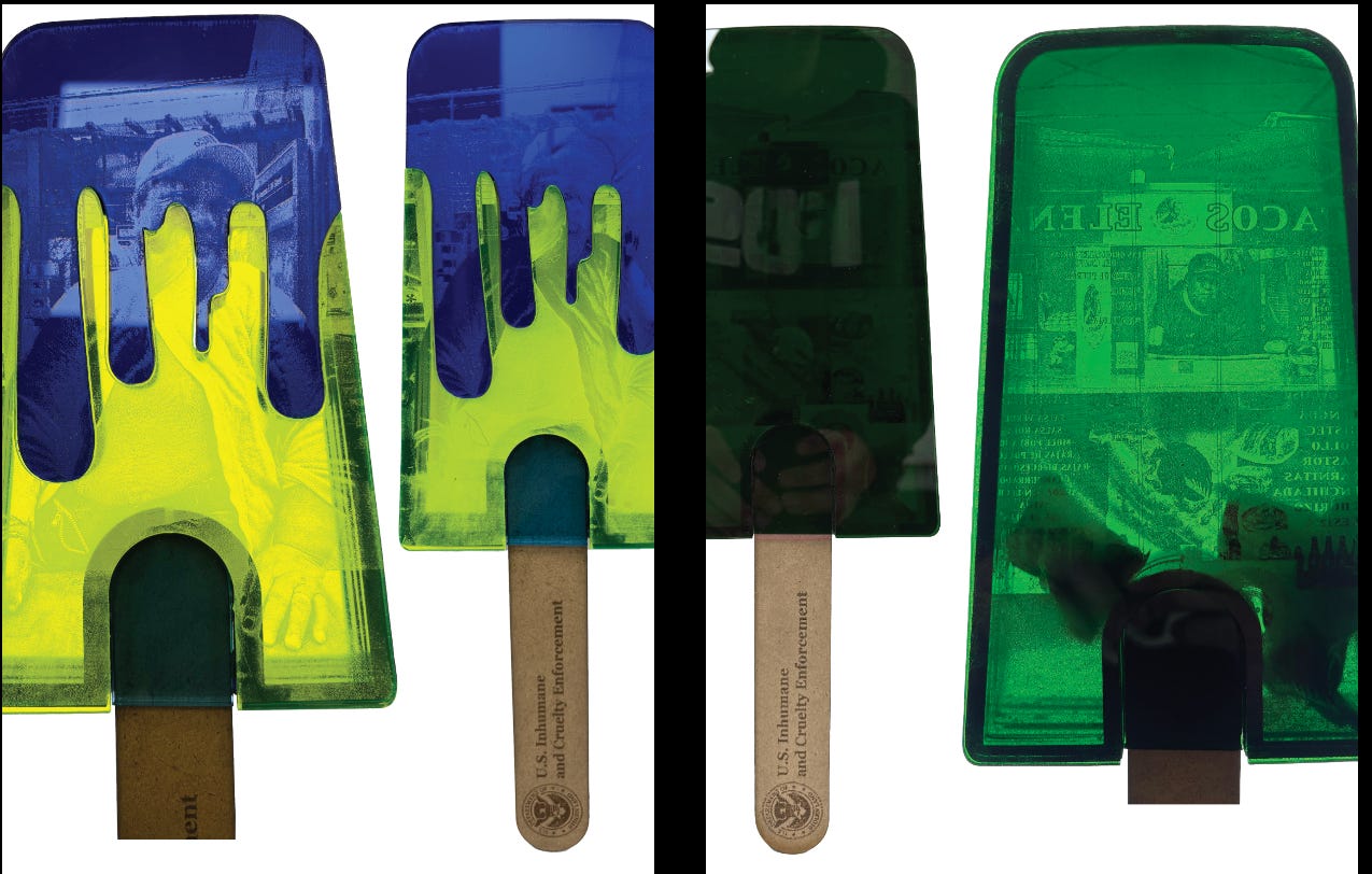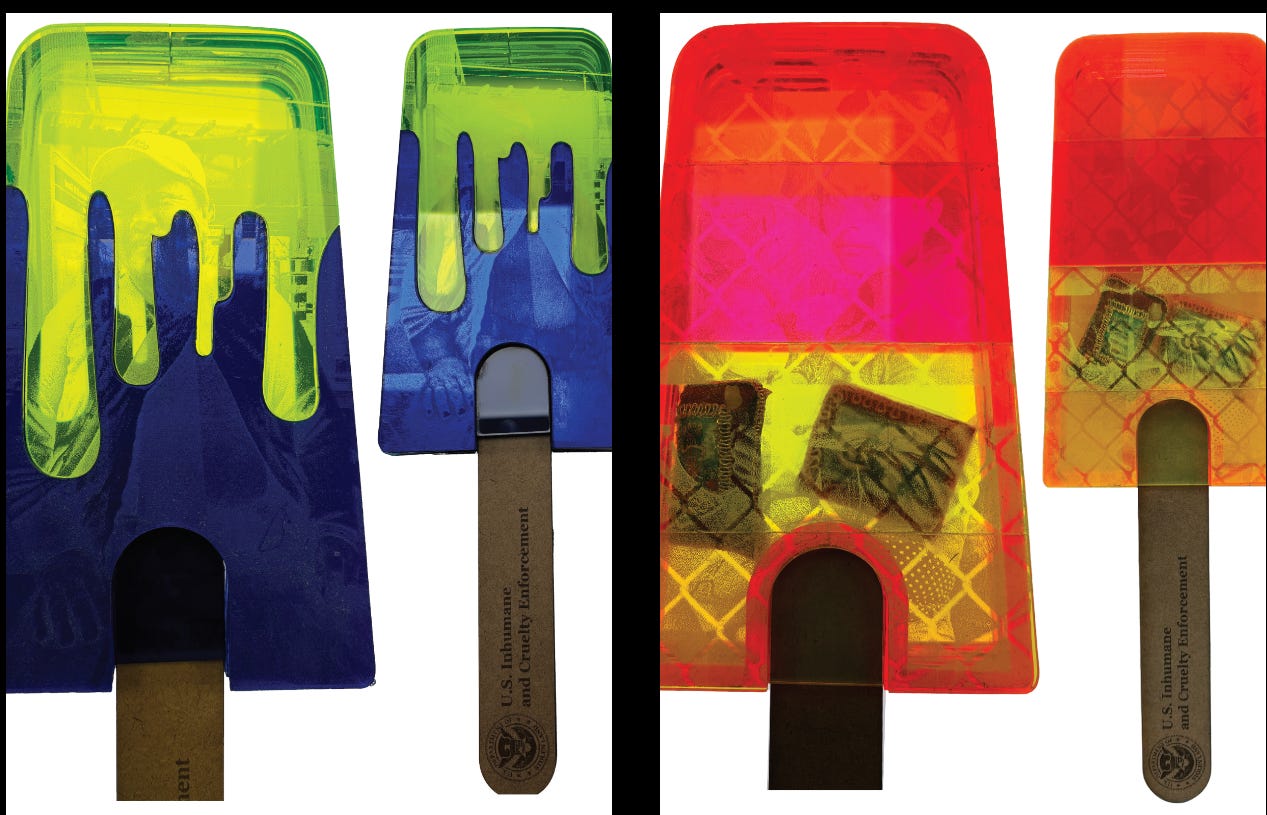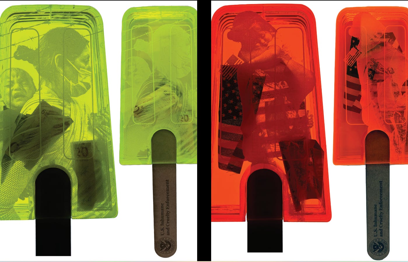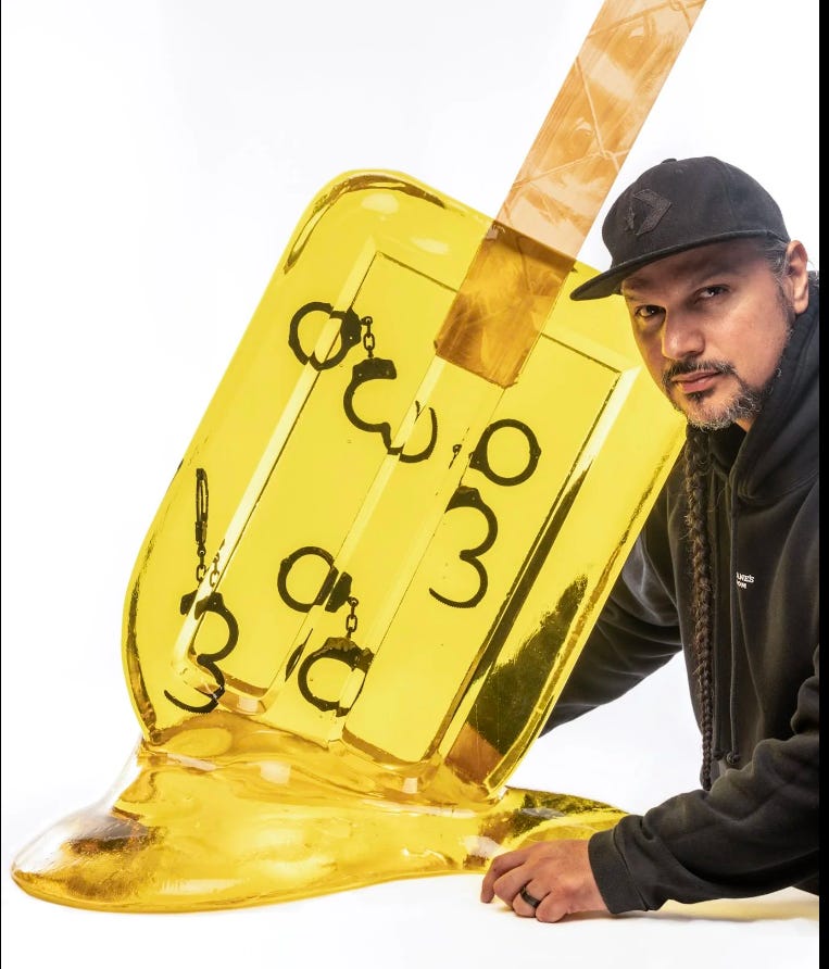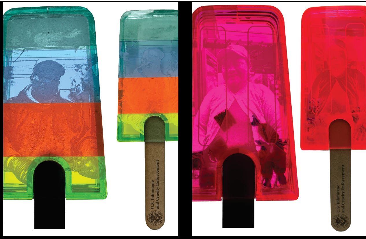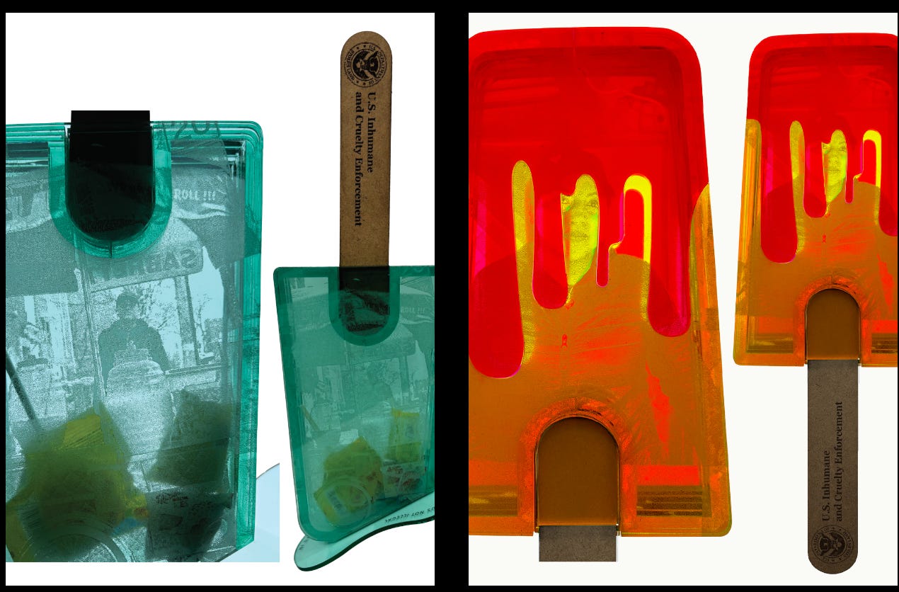 Marka27’s I.C.E. Scream series is a visual protest turning something as familiar as a paleta into a powerful symbol of systemic oppression. At first glance, the brightly colored frozen treats evoke nostalgia, but a closer look reveals a chilling reality. Made from resin as well as acrylic, these paletas contain etched images and encapsulated objects ranging from handcuffs to flowers and rosaries—celebrating the strength and resilience of indigenous communities while representing the struggles of immigrant families caught in the U.S. immigration system.