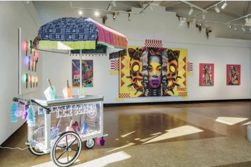 Quiñonez created giant, melting paletas — confrontational pieces that contain handcuffs or revolvers, like a fossilized dragonfly suspended in amber. Another piece brings the hustle of immigrant street food vendors into plain view — a clear paleta cart shaded by an umbrella printed with quiet American flags. Happy tassels are on the cart’s handle. But the broad side that patrons can see? It’s emblazoned with a message: “I.C.E. SCREAM.”