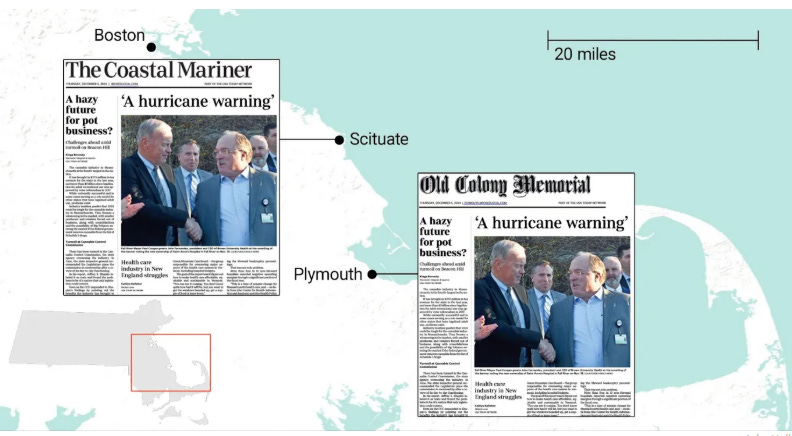 [Despite being published 20 miles apart, the front pages of Gannett’s papers in Scituate and Plymouth, Mass., are identical. These pages from Dec. 5 carry no stories local to the communities they serve.]