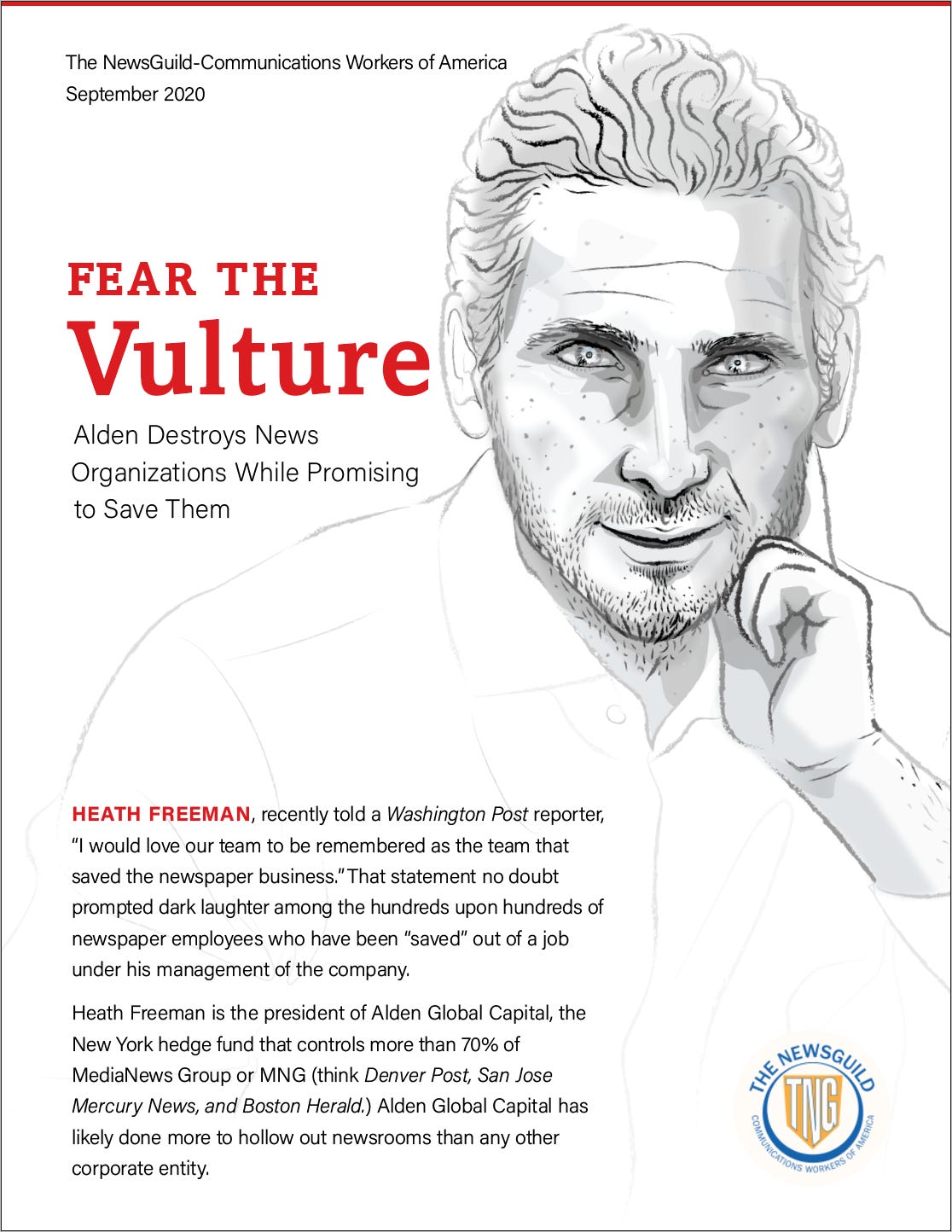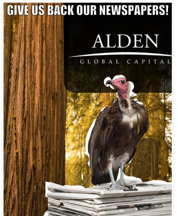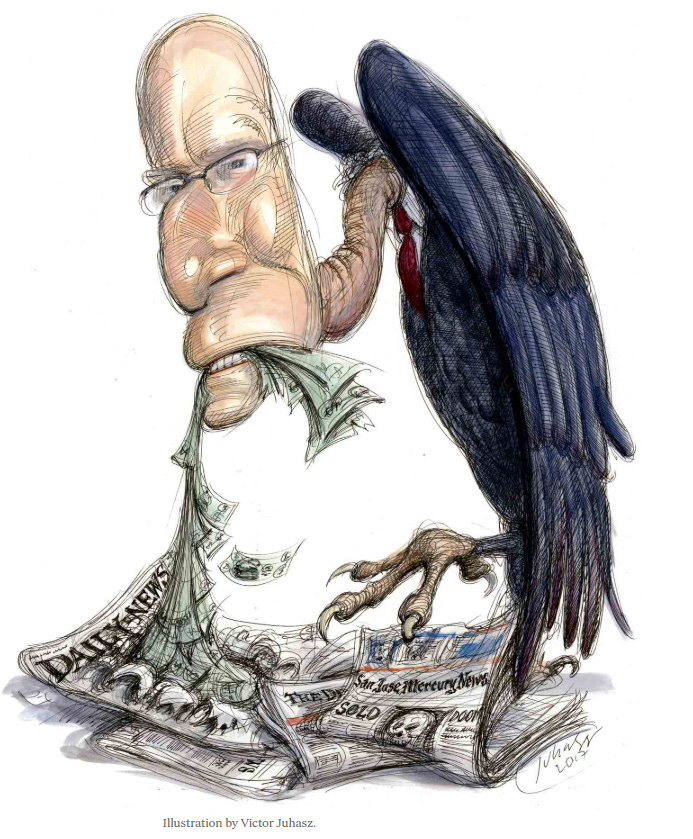 The film lays bare the crimes of hedge funds, those so-called vulture capitalists buying up newspapers for the real estate they encompass. There have been billions of dollars stripped from some of the more well-known newspapers. Alden is the second-largest newspaper owner in the United States, controlling approximately 200 newspapers through its subsidiaries, MediaNews Group (also known as Digital First Media) and Tribune Publishing.