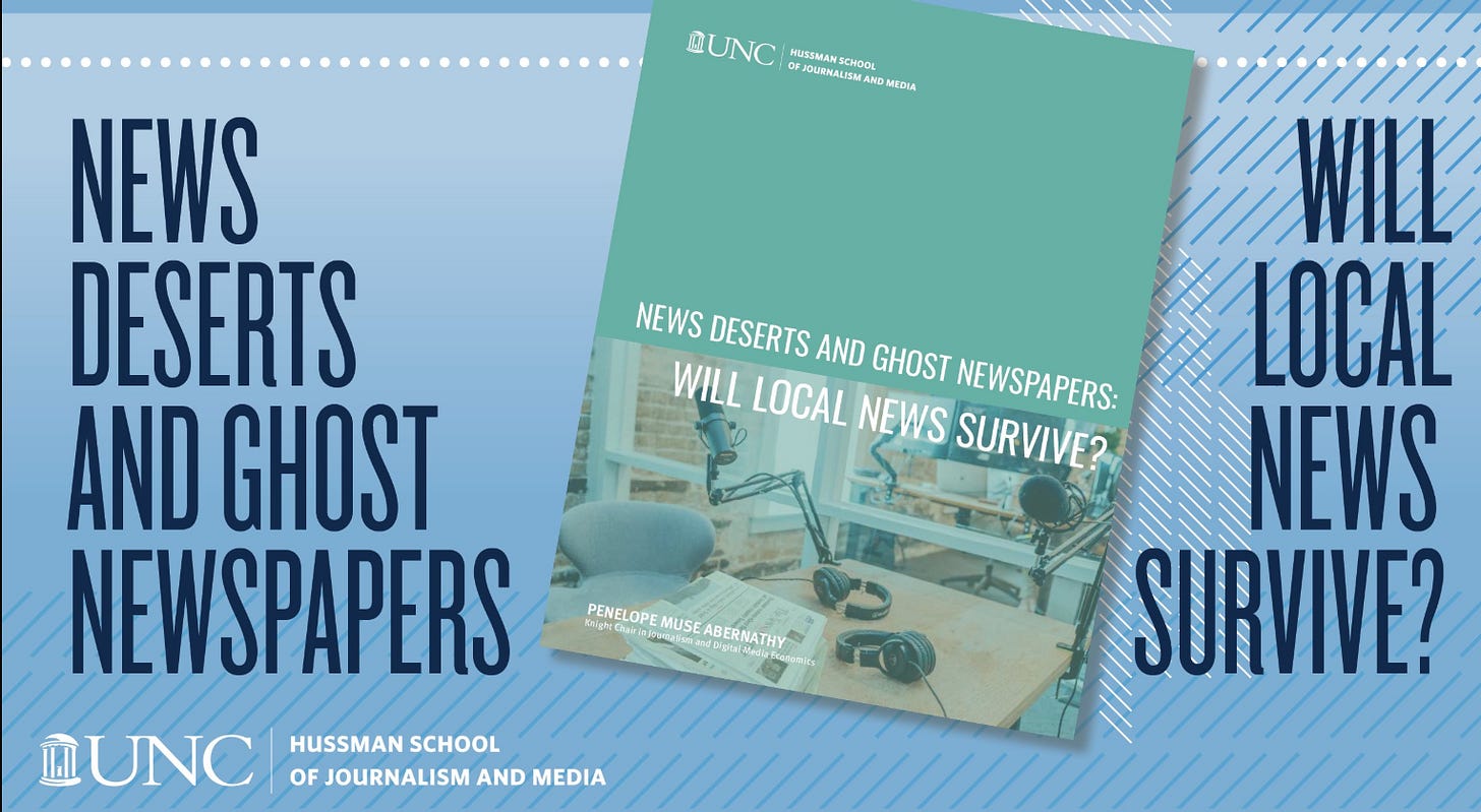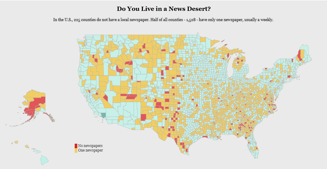 We know about food deserts and healthcare deserts, but who reading this knows about news deserts? Go to the website, usnewsdeserts.com, and you will find more than 350 interactive maps allowing the user to drill down to the county level to understand the state of local media in communities throughout the United States.