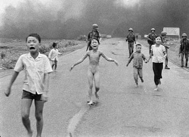 Severely burned in an aerial napalm attack, children run screaming for help down Route 1 near Trang Bang, followed by soldiers of the South Vietnamese army’s 25th Division, on 8 June 8 1972. A South Vietnamese plane seeking Viet Cong hiding places accidentally dropped its flaming napalm on civilians and government troops instead. Nine-year-old Kim Phuc (centre) had ripped off her burning clothes while fleeing. The other children (from left) are her brothers Phan Thanh Tam, who lost an eye, and Phan Thanh Phouc, and her cousins Ho Van Bon and Ho Thi Ting. This photo won the 1973 Pulitzer Prize for spot news photography. Photograph: Nick Ut/AP