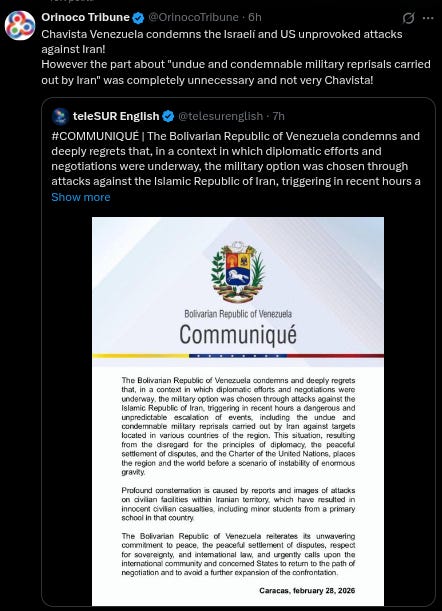 Venezuelan authorities described the military response by Iran against targets in various countries as “undue and condemnable,” questioning the right to self-defense, despite the fact that the Iranian response targeted US military assets throughout West Asia, not civilian installations.