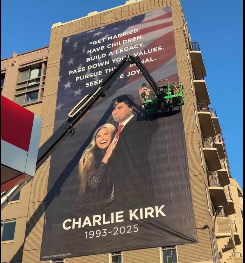 This is what these cunts in Portland LOVE: The Department of Education hung a banner of the late conservative activist Charlie Kirk outside its headquarters as the country prepares to celebrate its 250th birthday.