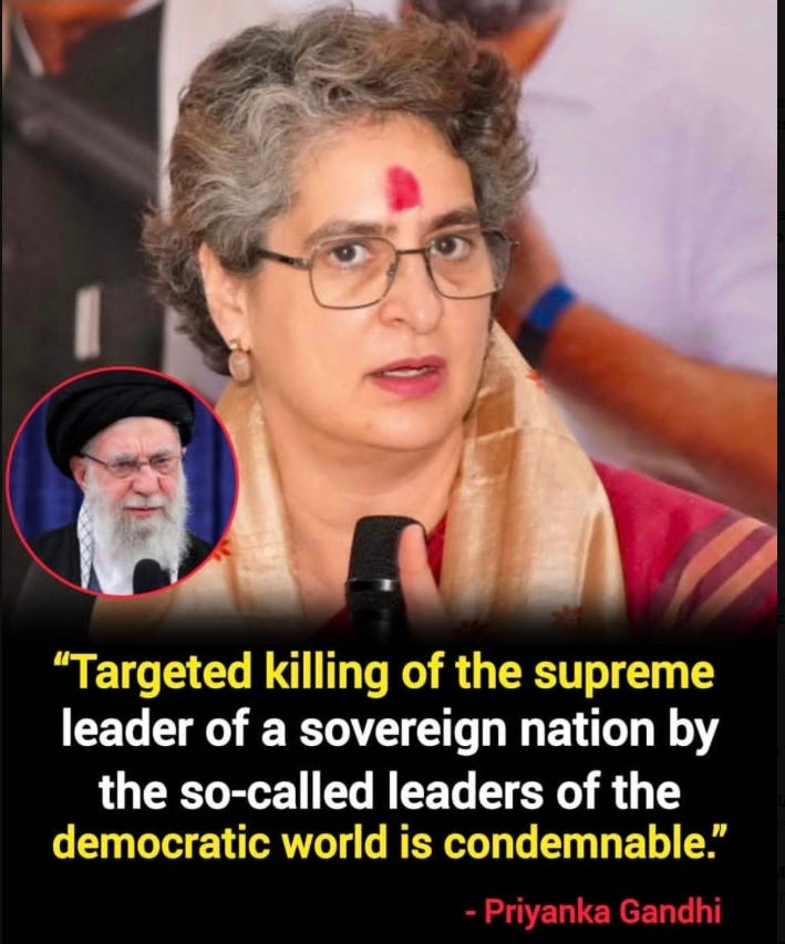 Congress leader Priyanka Gandhi condemns the targeted killing of Iran’s Supreme Leader Khamenei, calling it a despicable act by So-called democratic powers.