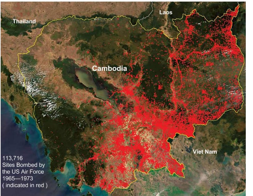 The United States dropped upwards of 2.7 million tons of bombs on Cambodia, exceeding the amount it had dropped on Japan during WWII (including Hiroshima and Nagasaki) by almost a million tons. During this time, about 30 per cent of the country’s population was internally displaced.