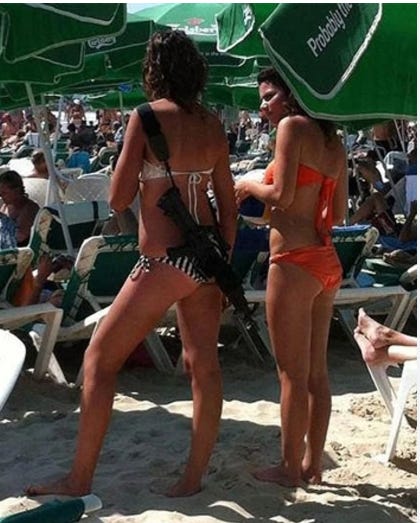A female Israeli soldier walks along the beach with her assault rifle
