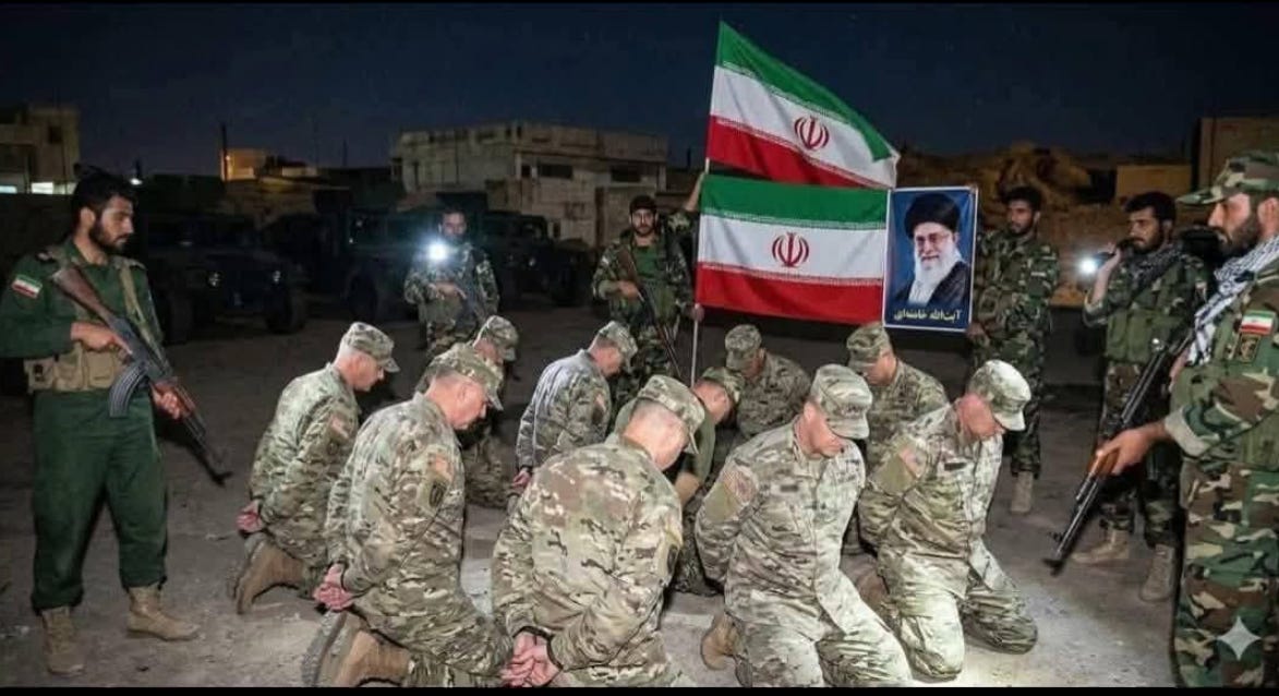 A fake, but oh, would it be so fucking COOL: Iran’s official Islamic Republic TV is showing photos of 180 American soldiers from Delta Force captured after they reportedly tried to carry out a landing operation inside Iranian territory.
