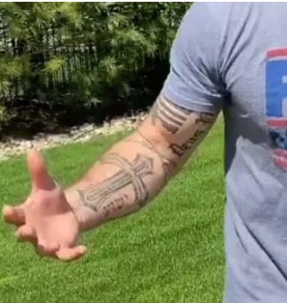 [Cross with sword with Hebrew — The cross cum sword with Hebrew lettering beneath it on his right forearm was reportedly the first tattoo that Hegseth got while on holiday. The Hebrew lettering spells out Yeshuah, which can symbolise Jesus among Christian groups.]