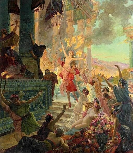 In some accounts, it is said that during a drunken celebration Thaïs – the mistress of Ptolemy I Soter – proposed the burning as a symbolic act of revenge for Xerxes’ destruction of Greek sanctuaries.