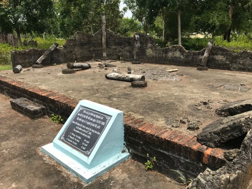 [The foundation of a hut in My Lai village, destroyed by US troops on March 15, 1968. The marker in front lists those who lived there and died in the My Lai massacre.]