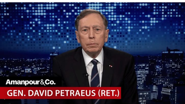 [Retired Army four-star General David Petraeus and former head of the CIA — whose greatest strategic victory was either marrying the daughter of a four-star general or avoiding jail time after leaking classified information to his mistress — has become one of cable news’s most sought-after Iran analysts.]