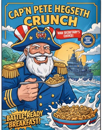 Iranian heroes versus . . . There you have the great American cook-off with the Department of War Crimes with Cap’n Crunch Hegseth….The Brief