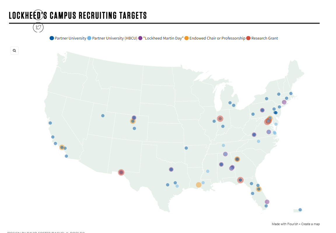 On campus, Lockheed has set up recruiting tables in the lobbies and hallways of student buildings and hosts workshops on everything from space exploration to résumé-building. At the University of Texas at Arlington, a $1.5m donation resulted in one of their buildings being renamed the Lockheed Martin Career Development Center.