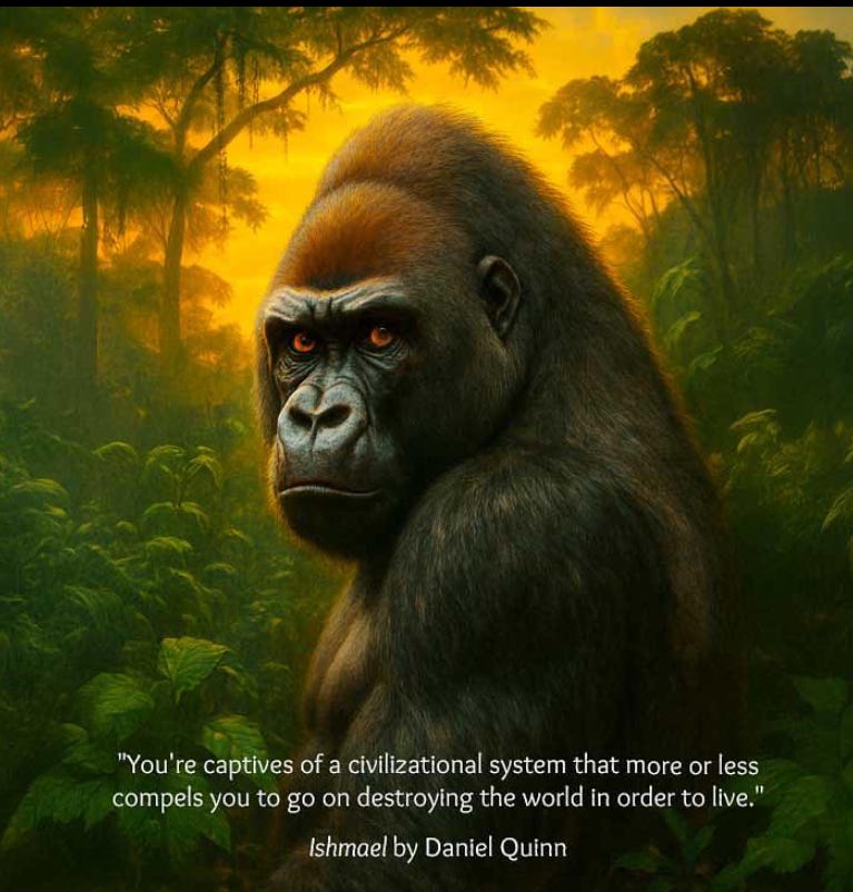 “I want to prove him WRONG,” the design student said. Wrong about what? She IS young and enthusiastic, so she can’t prove him wrong about that. What are the two of them really talking about? What her advisor is hearing from her is something like this: “I’m not going to end up like YOU. You never made any difference in your whole life. Well, I’m not going be like you. I’m going to make a difference.” And of course he’s defending himself the only way he knows how. He can’t say, “Look, kiddo, you may not believe it, but student advisors make PLENTY of difference.” He probably doesn’t even believe it himself! Why would he? He’s been told from childhood that only big shots make a difference. Since he can’t say this, he says instead, “Believe me, you WILL end up like me. What YOU have aren’t ideals, they’re just illusions. Nothing you do will make any difference, and life is going to prove me RIGHT.” He actually has a vested interest in discouraging students, in preparing them for extinction. Their failure will be his vindication! The vein of pessimism runs deep in our culture and is broadcast like a virus in all our communications—including all our communications directed to those of you who belong to the nations of the First People. Three years ago a young Navajo student at Dartmouth managed to track down my unlisted phone number. He told me that over the years he’d drifted away from his cultural roots. Then he read Ishmael. He was calling because he wanted to give me his reaction personally, and this was his reaction: “You’ve given me back my religion.” I asked him to explain why he felt this way, because of course there’s nothing in my book about Navajo religion in particular. He said, “When I was growing up among my own people, I was taught to think of humans as a blessing on the world. Living among your people, I’ve been taught to think of humans as a curse on the world. I didn’t notice it happening until I read your book, and that’s how you’ve given me back my religion.”