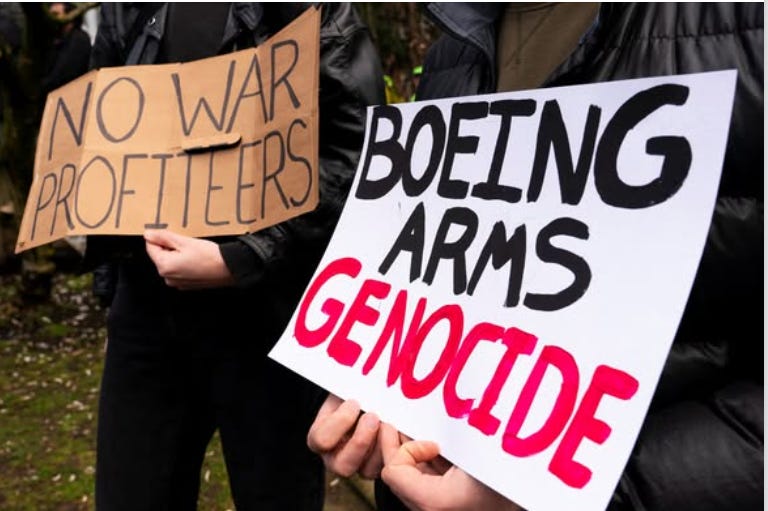 Boeing has produced thousands of the GPS-guided bombs dropped on Gaza. Boeing also helped build many of the air force bases in Saudi Arabia and throughout the Gulf region to guard U.S. oil investments there.