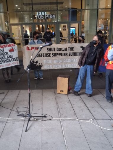 Under the coordination of Boeing, contractors from over 25 countries held the Defense Suppliers Summit in the Seattle Convention Center. This is the same place where the ill-famed World Trade Organization Meeting was held in 1999. At that time, tens of thousands of demonstrators gathered in Seattle to fight back against the imperialist world trading order that moved manufacturing to low-wage countries and depressed wages for all workers.