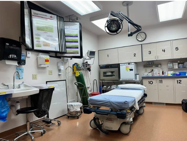 [The emergency department at Big Sandy’s hospital consists of a single room with two beds and only a curtain between between them for privacy. Rancher Shane Chauvet was stabilized here after a piece of metal nearly severed his arm during a windstorm a few years back.]