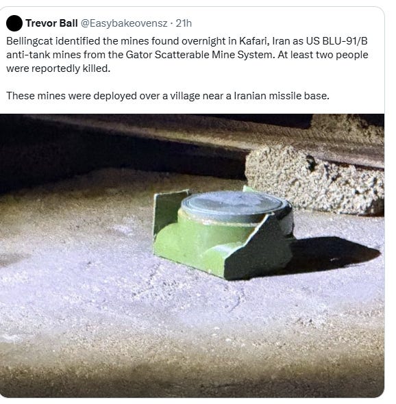 Air-dropped mines discovered in Kafari, a village near Shiraz in southern Iran, appear to be American-made Gator anti-tank munitions, according to an investigation by open-source intelligence outlet Bellingcat. Experts identified the devices as BLU-91/B mines delivered via cluster munitions, with debris consistent with aerial deployment. Bellingcat noted the United States is the only party in the conflict known to possess Gator Scatterable Mines, and analysts believe the weapons were placed to deny vehicle access to a nearby Iranian “missile city,” preventing repair or recovery operations at the site.