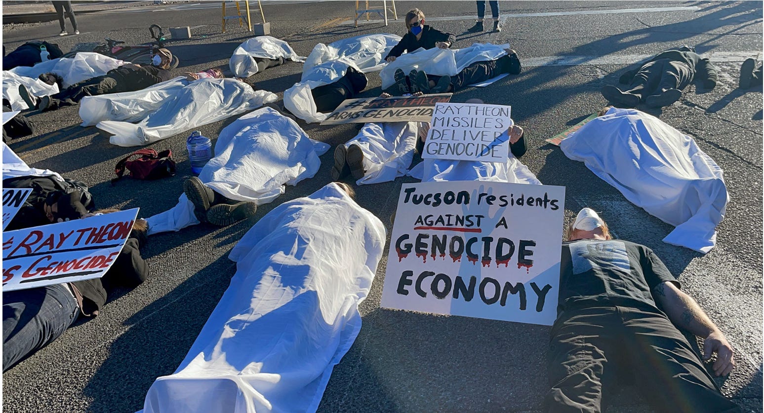 - Past Raytheon Protests (Late 2023): Groups including the Tucson Coalition for Palestine, Arizona Palestine Solidarity Alliance, and Jewish Voice for Peace staged a “die-in” at Raytheon’s Tucson office in November 2023 to protest weapons sales to Israel.