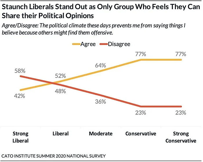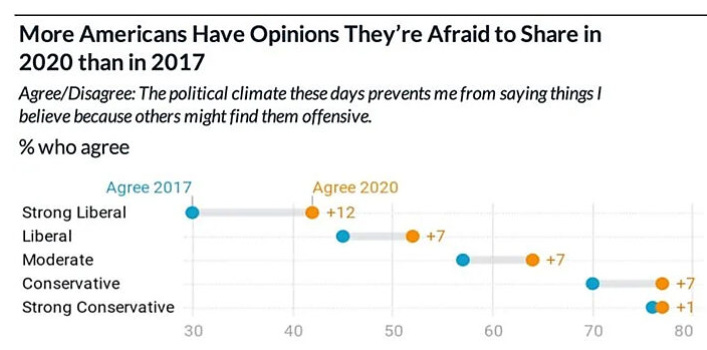 Self-censorship is on the rise since 2017. It’s up 12 points among progressives (30–42 percent), and up 7 points among centrist liberals (45 to 52 percent), moderates (57 percent-64 percent), and centrist conservatives (70–77 percent). Only staunch conservatives haven’t changed much, perhaps because 76 percent said they were already self-censoring three years ago.