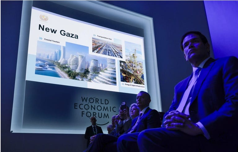 Secretary of State Marco Rubio listens to a presentation by Trump Administration officials about post-war Gaza following a signing ceremony for the “Board of Peace” at the World Economic Forum on January 22, 2026 in Davos, Switzerland.