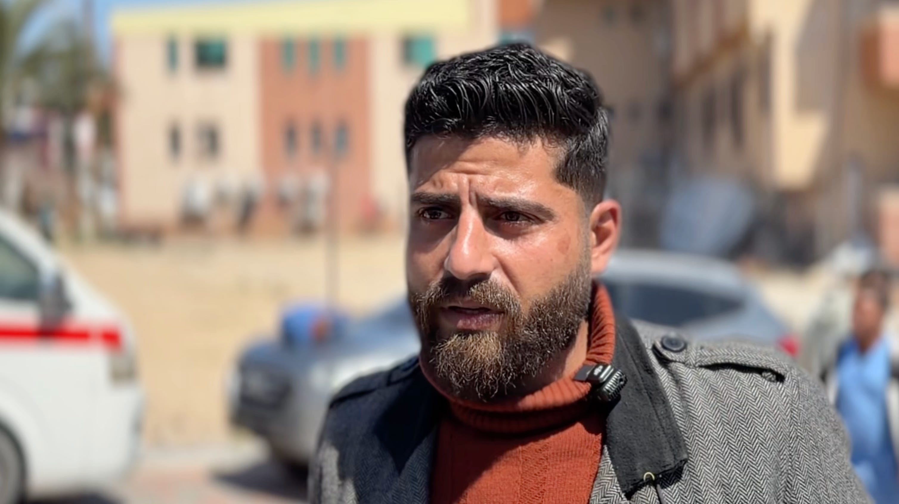 (top) Ahmed Al-Harsh outside Nasser Hospital in Khan Younis as he waits for his son, Mahmoud, to arrive after 2.5 years in Egypt. 9bottom) Ahmed Al-Harsh holds up a photo of his son Mahmoud on his phone. March 30, 2026. Screenshots of video provided by Abdel Qader Sabbah.