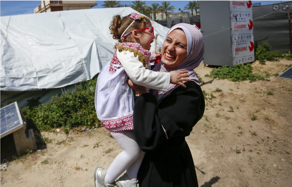 Sundus al-Kurd reunites with her daughter Bissan after 2.5 years in Khan Younis on March 31, 2026. Bissan was born premature and evacuated to Egypt during an Israeli military attack on Al-Shifa Hospital in November 2023.