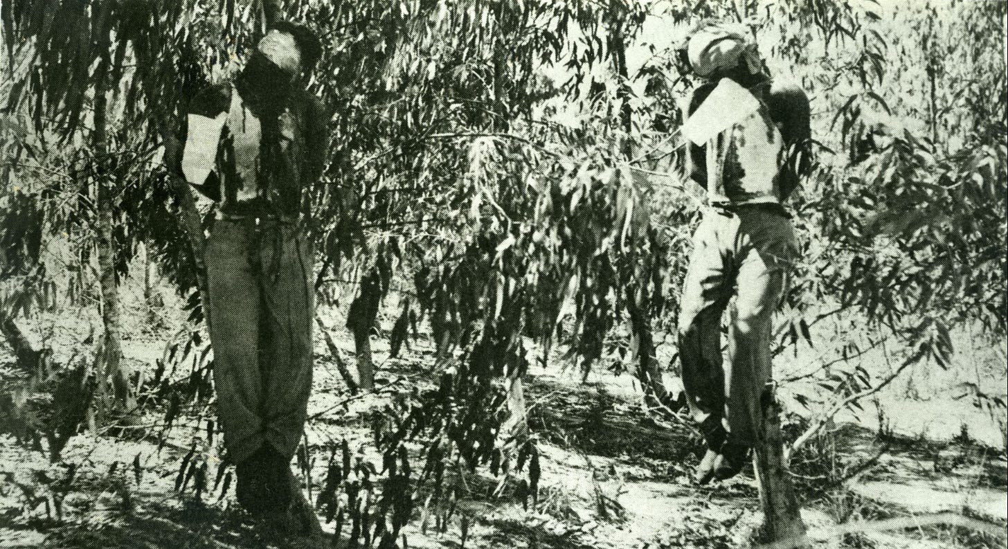 “Most deeply regret to inform you that the two bodies were found at 9 o’clock this morning in an eucalyptus grove at Umm Uleiqa, near Beit Lid. They were hanging from two trees. Notices were pinned to the bodies saying that the men had been hanged by the National Military Organisation as British spies. The first body was cut down by an Army captain, and as he bent over it a small bomb exploded, injuring him in the face. The surrounding area was found to have been mined.”