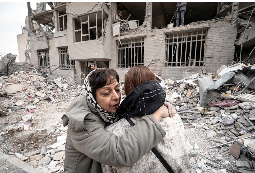 Targeted: Iranian women in the ruins of their apartment building, destroyed by US-Israeli bombing of residential areas, Tehran, 12 March 2026
