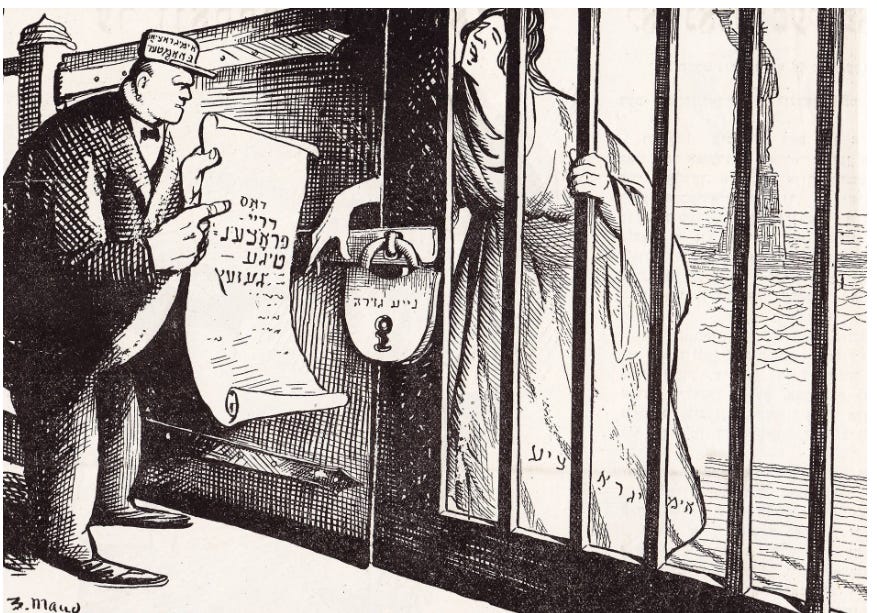 [According to the Letter of the Law by Zuni Maud, depicting the effects of the Emergency Quota Act of 1921, which curtailed immigration to the United States. Published in Der groyser kundes,]
