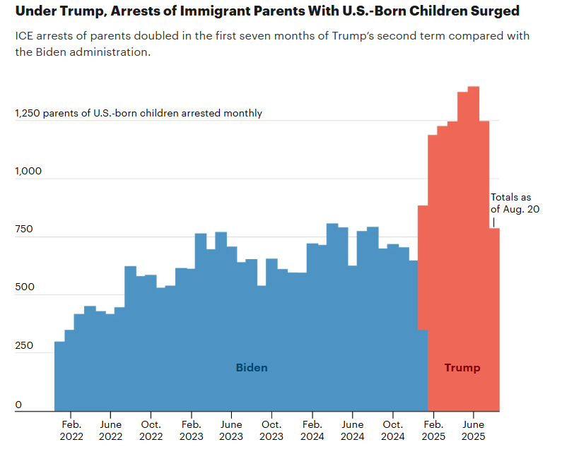 To calculate that Trump has deported mothers of U.S. citizen children at four times the rate that Biden did, we calculated the total number of mothers removed under each administration in the period covered by our data and divided by the number of days each president was in office during that period. We used the period from November 2023 through mid-August 2025 to minimize undercounting at the start and end of our detention dataset. We also compared equivalent seven-month periods in 2024 and 2025, which produced a similar result. For the purposes of our analysis, we counted a small number of detained mothers who agreed to leave the country voluntarily as having been deported.