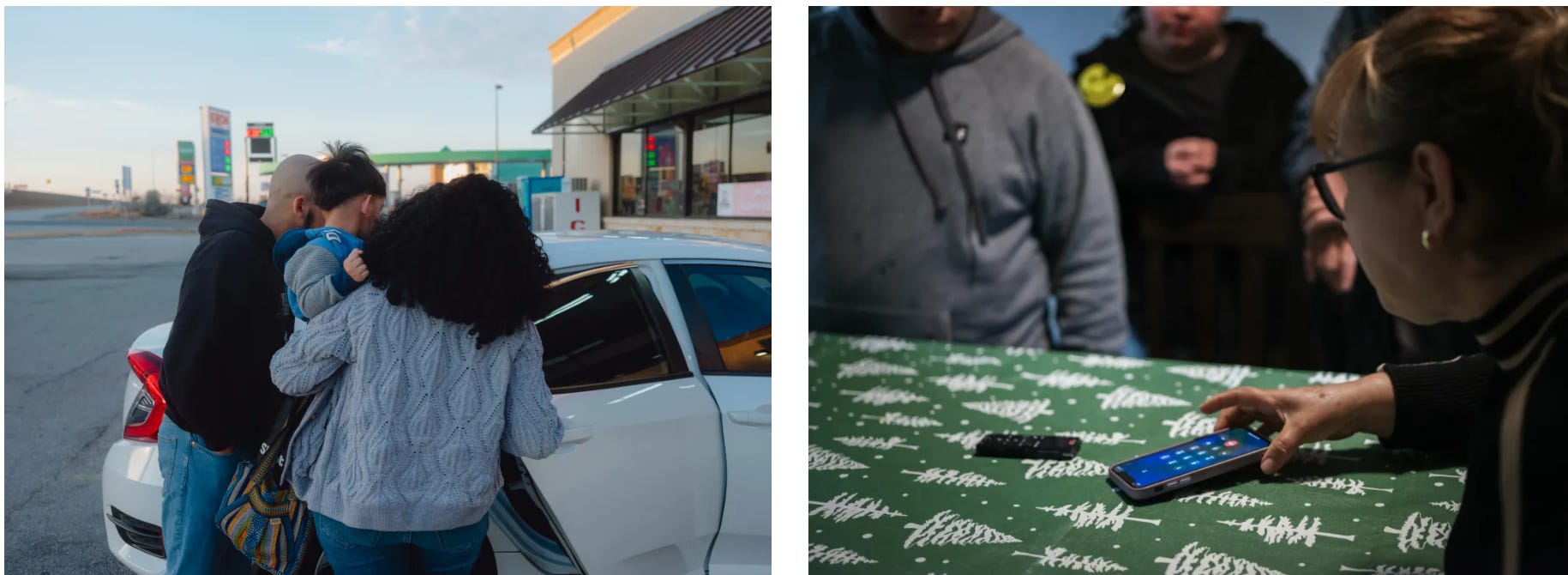 [ProPublica’s reporting shows that the parents of at least 11,000 U.S. citizen children were arrested and detained in the first seven months of the Trump administration’s immigration crackdown. First image: Two volunteers place a 2-year-old American child in a car so he can be reunited with his mother, who is from Honduras and awaits deportation at the Dilley, Texas, family detention center. Second image: Two American children, left, talk on the phone with their father, who is detained at “Alligator Alcatraz” in Florida after being arrested on Christmas.]