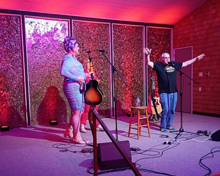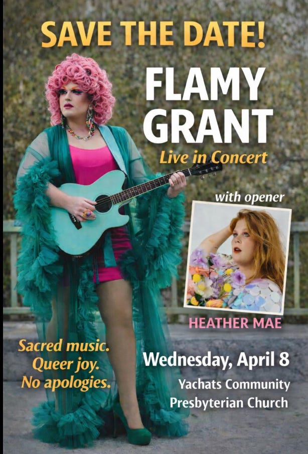 So, a very interesting night, for sure. Lots of songs about the hypocrisy of religion, and both Flamy and Heather talked about their bible school days. The crowd in Yachats was old, and many of the same-sex or trans couples were there.