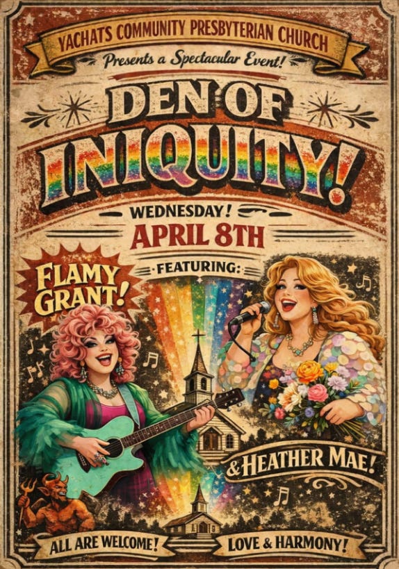 Both Heather and Flamy came from evangelical roots. And Pastor Bob got hit with threats of protests and Facebook posts about Den of Inequity. SO he printed up t-shirts.