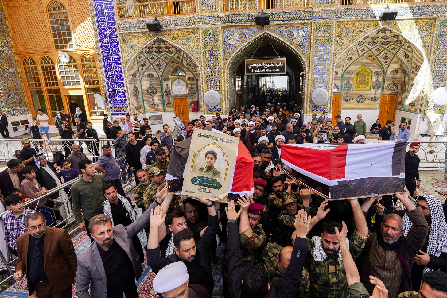 People attend the funeral ceremony of Popular Mobilization Forces members killed in a U.S. airstrike on a base in Iraq’s Anbar province, at the Imam Ali shrine in Najaf, Iraq on April 1, 2026. Photo by Karar Essa/Anadolu via Getty Images.