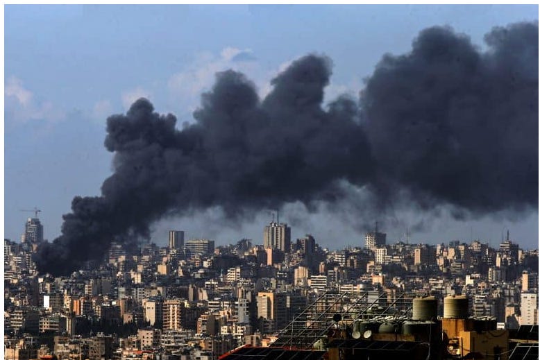[Smoke billows from Beirut’s southern Dahiya suburb following Israeli airstrikes across Lebanon as a two-week ceasefire is announced in the U.S.-Israeli war on Iran, April 8, 2026. ]