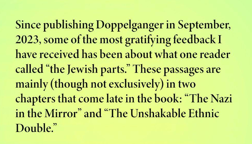 Since publishing Doppelganger in September, 2023, some of the most gratifying feedback I have received has been about what one reader called “the Jewish parts.” These passages are mainly (though not exclusively) in two chapters that come late in the book: “The Nazi in the Mirror” and “The Unshakable Ethnic Double.”