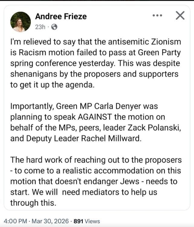 I am on some Green England Substack, and here it is — Greens: Zionism is Racism