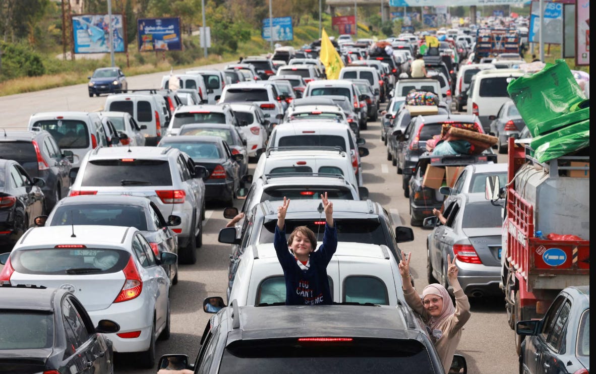 [Children gesture from a vehicle as displaced people make their way to return to their homes after a 10-day ceasefire between Lebanon and Israel went into effect, near Tyre, Lebanon, 17 April.]
