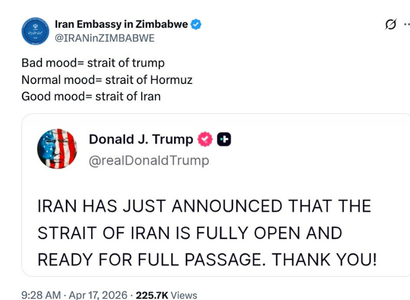 The Strait of Hormuz is not fully open in practice, as ships must follow routes controlled or approved by Iran, while a U.S. naval blockade is still in effect. Meanwhile, falling oil prices are driven less by actual changes in conditions and more by market expectations that a U.S.-Iran nuclear deal may happen soon. Those expectations may be overly optimistic given ongoing uncertainties and unresolved tensions. Iran is trolling the President this afternoon.