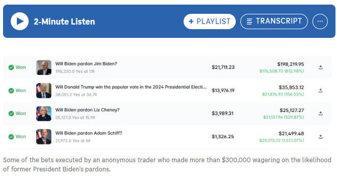 The sickness of these gamblers: In the final hours of President Biden’s term, a Polymarket trader made around $300,000 correctly betting on Biden’s last-minute pardons, according to new data provided to NPR by an analytics firm that examines cryptocurrency transactions.