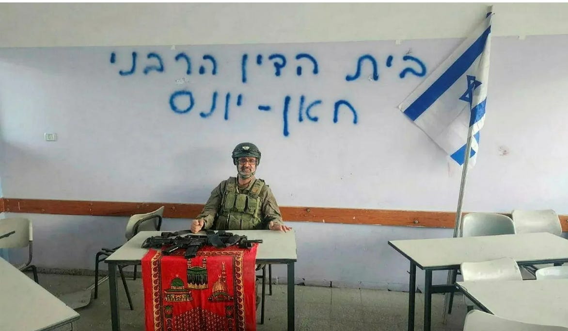 [Avraham Zarbiv in Gaza, in December 2023. ‘The Rabbinical Court of Khan Yunis’ is graffitied on the wall behind him.]