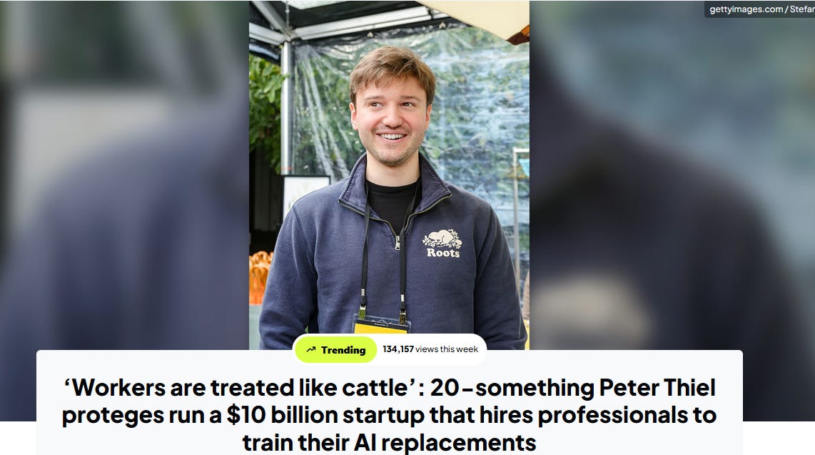 The 22-year-old founders who hail from the Bay Area are Thiel Fellows — members of the billionaire investor Peter Thiel’s program that provides $200,000 grants to young people who are skipping or quitting college (3). And they have become the youngest self-made billionaires. CEO Brendan Foody, CTO Adarsh Hiremath and board chairman Surya Midha each have a roughly 22% stake in the company, Forbes estimates (4).