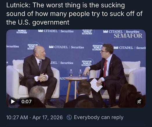 Just who is “sucking off the US government,” Secretary Lutnick? He doesn’t say, but I can assure you who he’s NOT accusing of abusing U.S. taxpayer money.