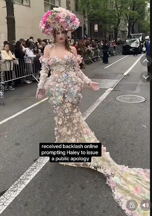 which reminded me of the article. The outrage her tasteless video prompted a movement subsequently called the “digital guillotine” as millions of regular people started to block celebrity and corporation social media accounts they were and were not following. The excess on display at the MET gala was juxtaposed next to a march in support of Palestine, hundreds of metres away and the fury at the video using the sound at the insensitivity and deafness to the suffering of people at the hands of a genocide, where internationally agreed, illegal and barbaric tactics of starving a civilian population are being used.