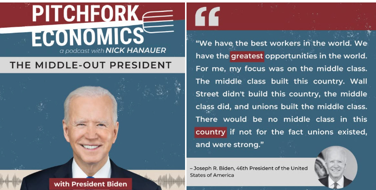 I’m very excited to share that in this week’s episode of Pitchfork Economics, Goldy and I get to sit down with President Joe Biden. President Biden lays out the transformative middle-out economic vision at the heart of his presidency, from investing in workers and rebuilding infrastructure to empowering unions and revitalizing American industries. He also explains why a thriving middle class isn’t just good for workers—it’s the engine that drives the entire economy. This is a must-listen conversation with the leader who’s successfully broken the failed, trickle-down consensus that’s dominated Washington DC for the past forty-plus years, putting working Americans back at the center of economic policy, where they belong.